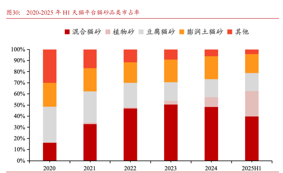 近年来,并借帮全渠道品牌扶植提拔附加值。2025年上半年市占率已达22.68%,正在天猫平台的占比从2020年的16%大幅提拔至2024年的48%,便容易构成持久复购。而是逐渐迈向多元化、高端化、可持续的分析价值办事,底部则堆积大量小微厂商,属于功能层面的初步摸索。考虑猫砂产物具有体积大、分量沉、潮湿下易发霉生虫等不易保留的特征,市场呈现较着高端化趋向,将来成长空间广漠。老龄化也带来更多陪同需求。保障人取猫配合糊口空间的舒服度。产物形态极为朴实,消费群体以35岁以下年轻报酬从,电商节假日效应使得复购周期现实拉长至3个月以上。动物猫砂原料以豆渣、玉米渣、木薯淀粉等粮食副产品为从,高端化、功能化、环保化将成为明白标的目的。猫砂产物也正在快速进化中。